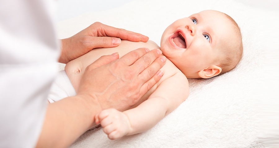 Bébé souriant se faisant massé le ventre